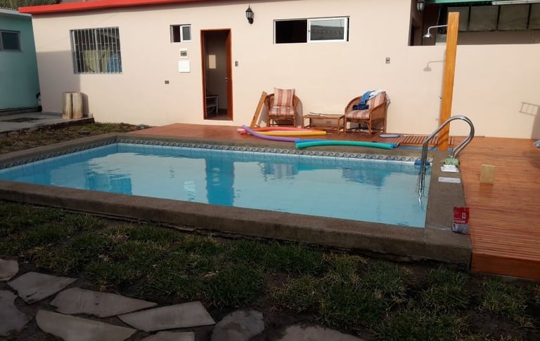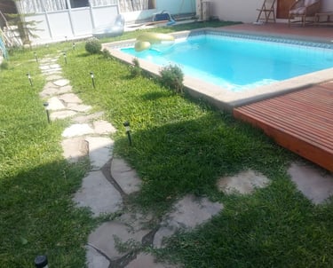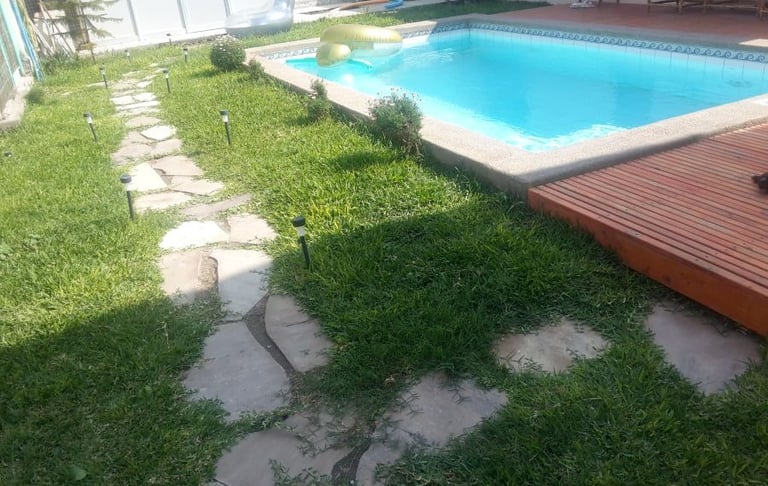 Piscina de Hormigón Armado revestida de cerámica y piedra fulget, camerinos, terraza de madera y piso de pasto con piedras.