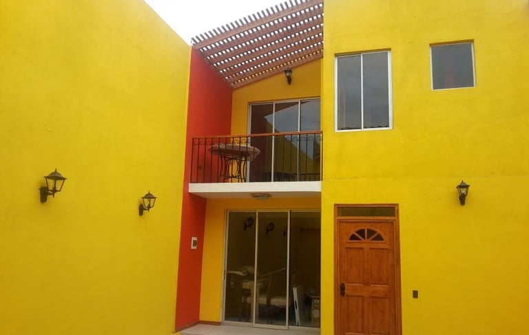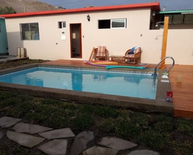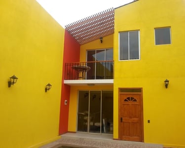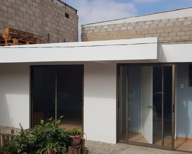 Casa Unifamiliar de tres pisos, dos pisos y una terraza estilo español. Casa edificada con bloques de cemento y revestida con estuco, estructura de hormigón armado, cubierta de planchas de zincalum prepintado. pisos de cerámica, con piscina y quincho.